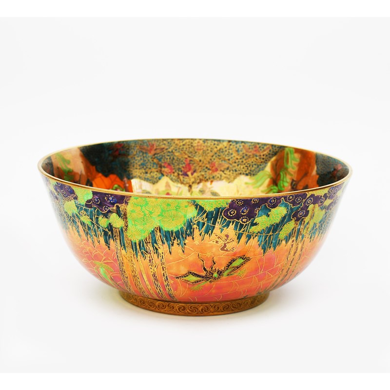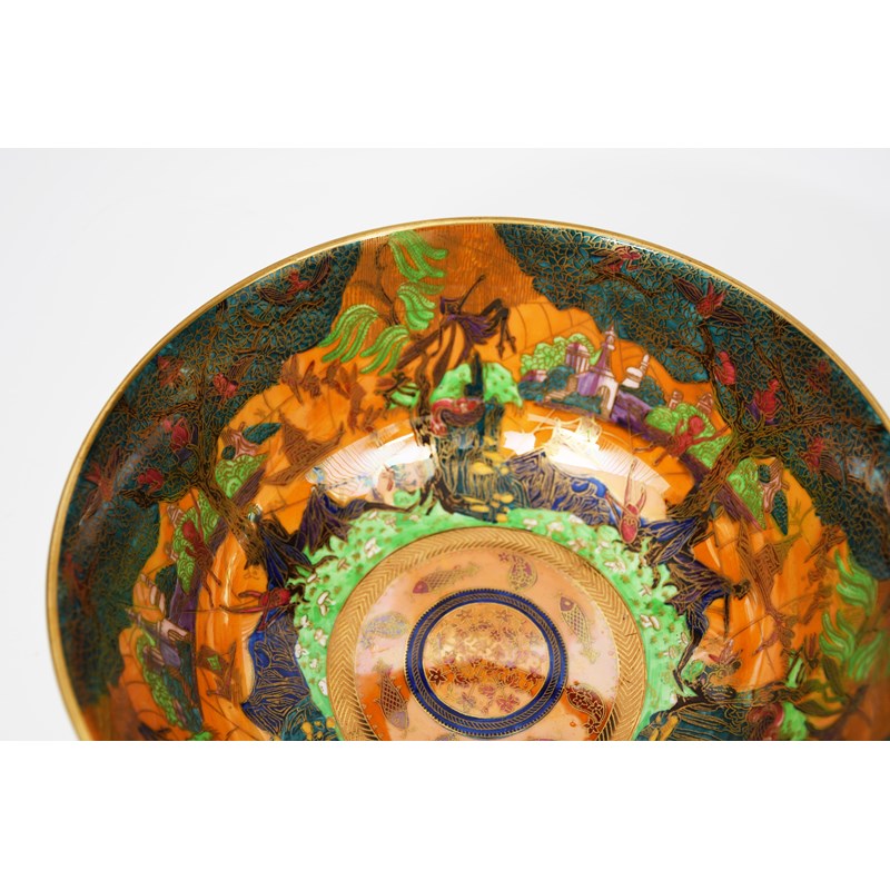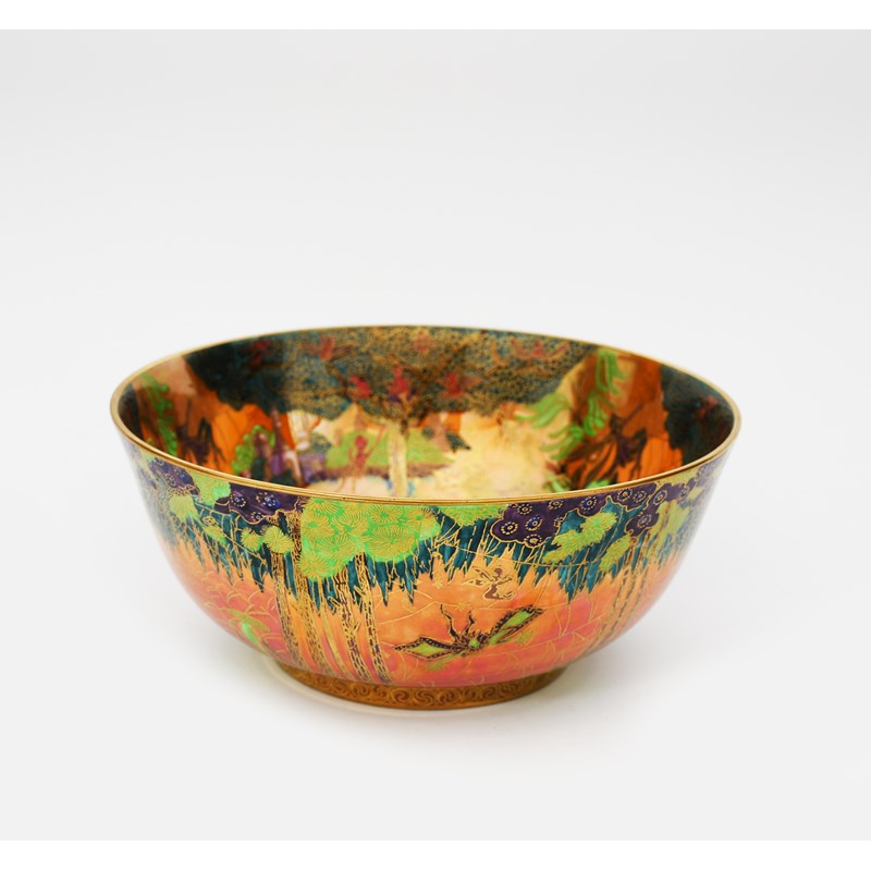 'Woodland Elves III' a Wedgwood Pottery Fairyland lustre Imperial bowl designed by Daisy Makeig-Jones, pattern no.Z.5481, printed and painted in colours and gilt on an orange flame lustre ground, printed and painted factory marks, 23.5cm. diam.