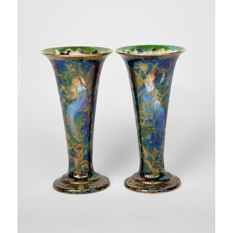 'Butterfly Woman' a pair of Wedgwood Pottery Fairyland lustre vases designed by Daisy Makeig-Jones, patten no.Z4968, printed and painted in colours and gilt on a black lustre ground, the interior pearl lustre printed and painted factory marks, 20cm. high (2)
