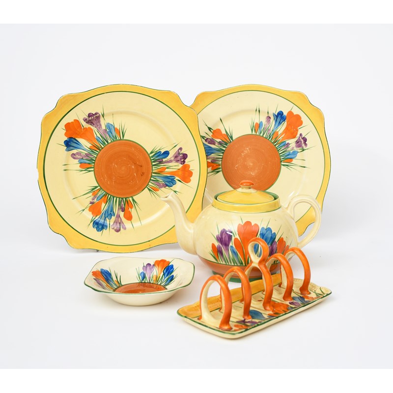 'Crocus' a Clarice Cliff Bizarre Globe teapot and cover, shape no.36, painted in colours, an en suite toast rack, two cake plates and a small square dish, printed factory marks, chips and wear to plates, 11cm. high (6)