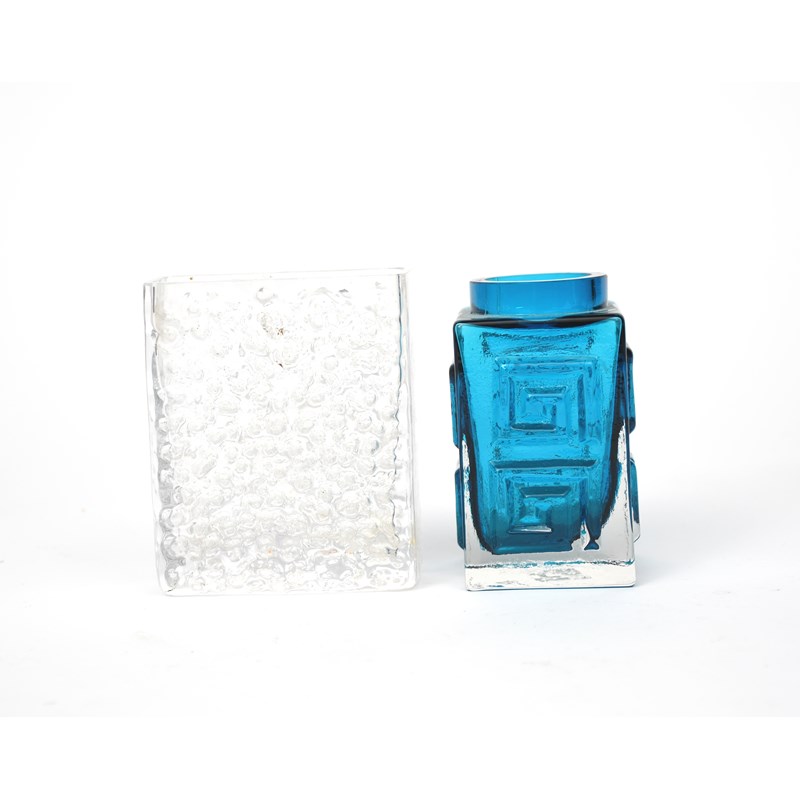 A Whitefriars Kingfisher Blue glass vase designed by Geoffrey Baxter, rectangular form with cast maze design, and another Whitefriars clear glass vase unsigned, 10.5cm. high (2)