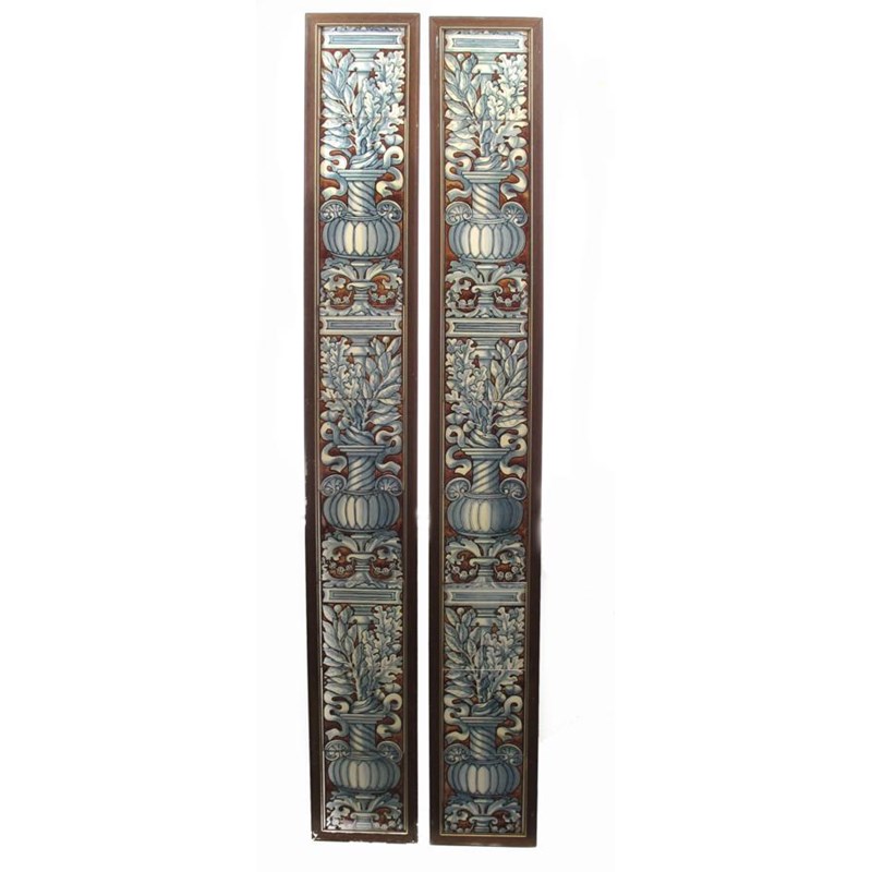 A pair of nine tile panels, probably W B Simpson & Sons, painted with classical urns with laurel sprays, glazed in shades of grey and brown, framed, 183cm. high