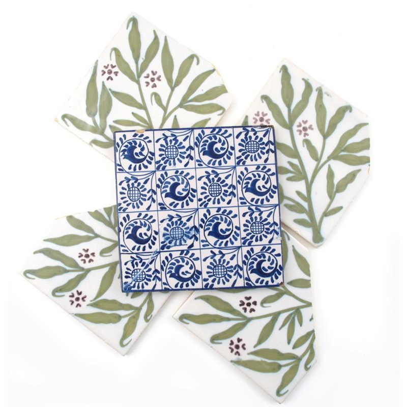 A Morris & Co tin-glazed Scroll pattern tile, painted in shades of blue on a white ground, and four Elsley pattern tiles, unmarked, chips and damages 15cm. wide