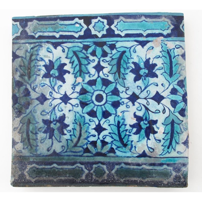 A middle eastern Qajar tile, painted with blue flowers and foliage on a white ground unmarked, restored glaze loss 23cm. square