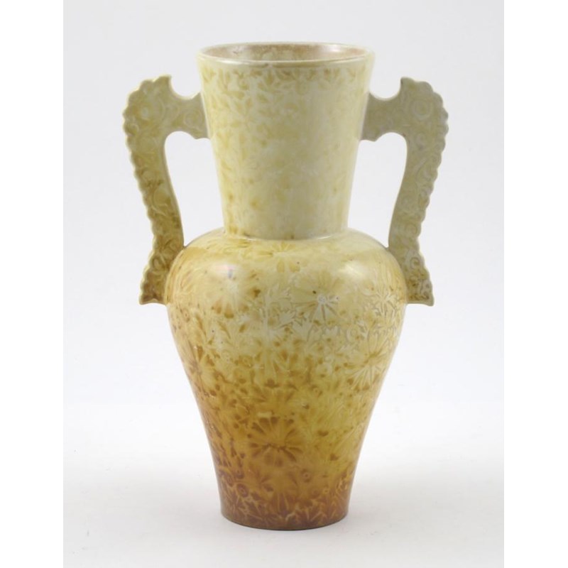A Clement Massier Aesthetic Movement pottery vase , dated 1887, shouldered form with flaring conical neck and applied handles, painted in yellow with all over floral design painted marks, professionally restored 29cm. high