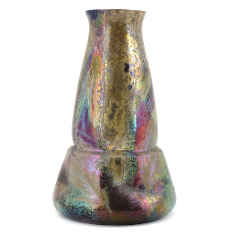 A Clement Massier Golfe Juan pottery, by Lucien Levy, tapering cylindrical form, painted with feather motif in golden iridescent glazes impressed marks, professionally restored top rim 23cm. high
