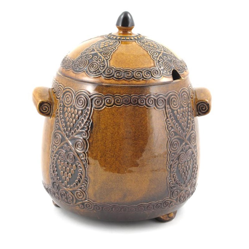 A German Secessionist soup tureen and cover, model no. 1645, modelled in low relief with stylised grape vine columns, glazed ochre stamped GL, KB 1645 30cm. high