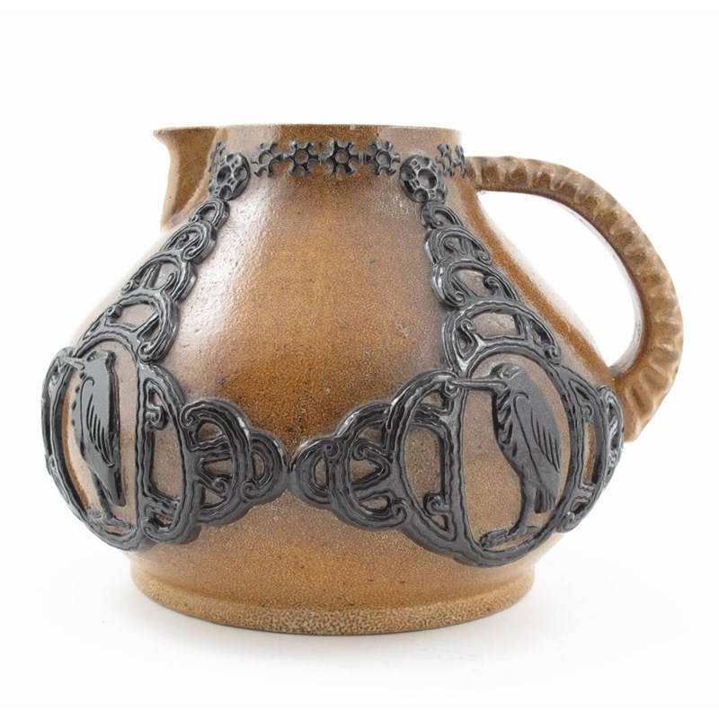 A Merkelbach stoneware jug, compressed form, applied with panels of heron inside scroll borders, in brown, the rim with cog motif impressed marks, chip to spout, 19cm. high