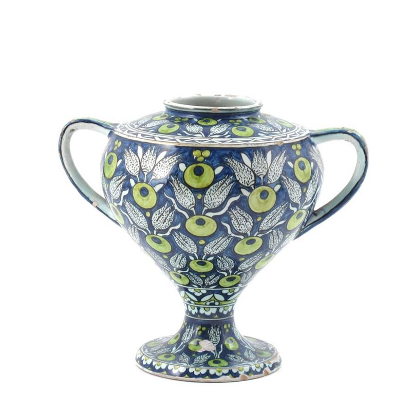 A Cantagalli twin-handled vase, painted with stylised berried foliage repeat in shades of yellow and blue, painted marks, glaze chips 19cm. high