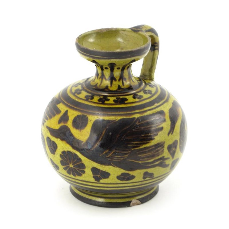 A Cantagalli Pottery jug, ovoid form with collar rim, painted with a frieze of geese in brown on a yellow/green ground painted mark to base, small chips to base rim 11cm. high