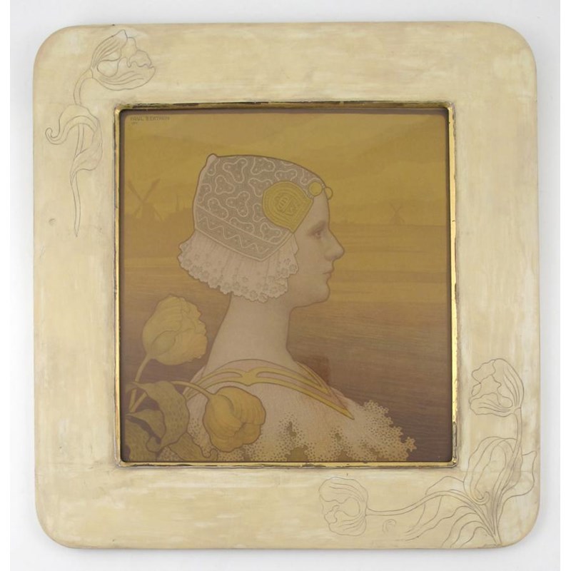'Sa Tres Gracieuse Majeste La Reine Wilhemine' a lithographic print by Paul Berthon, in original painted oak frame, incised with flower stems signed in the print, dated 1901 image 39.5 x 36cm.