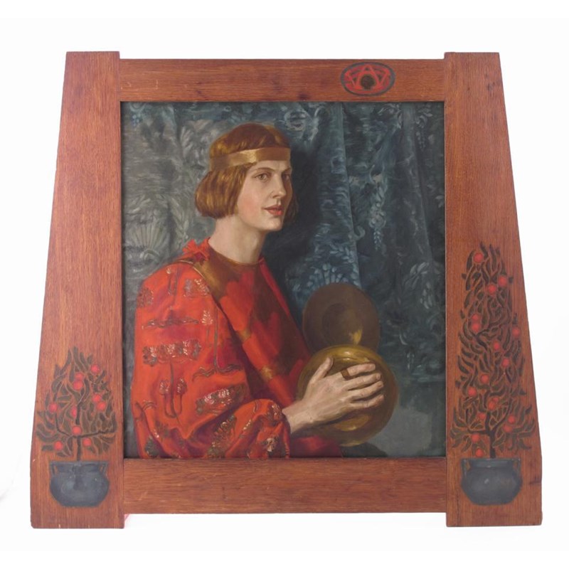 'The Cymbals Player' an oil on canvas, in original oak frame, with painted monogram and potted orange trees painted monogram to frame image 65 x 55cm.