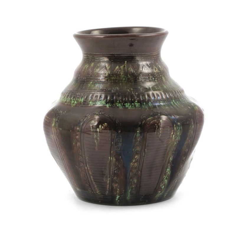A Linthorpe Pottery vase, designed by Dr Christopher Dresser, model no.159, covered in a green and brown glaze impressed factory marks, facsimile signature 17cm. high