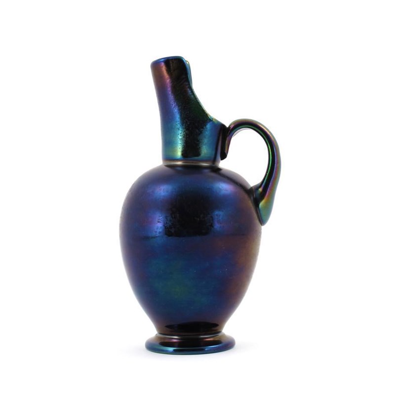A Webb Bronze glass jug, the design attributed to Dr Christopher Dresser, ovoid with cylindrical neck and loop handle unsigned 25cm. high