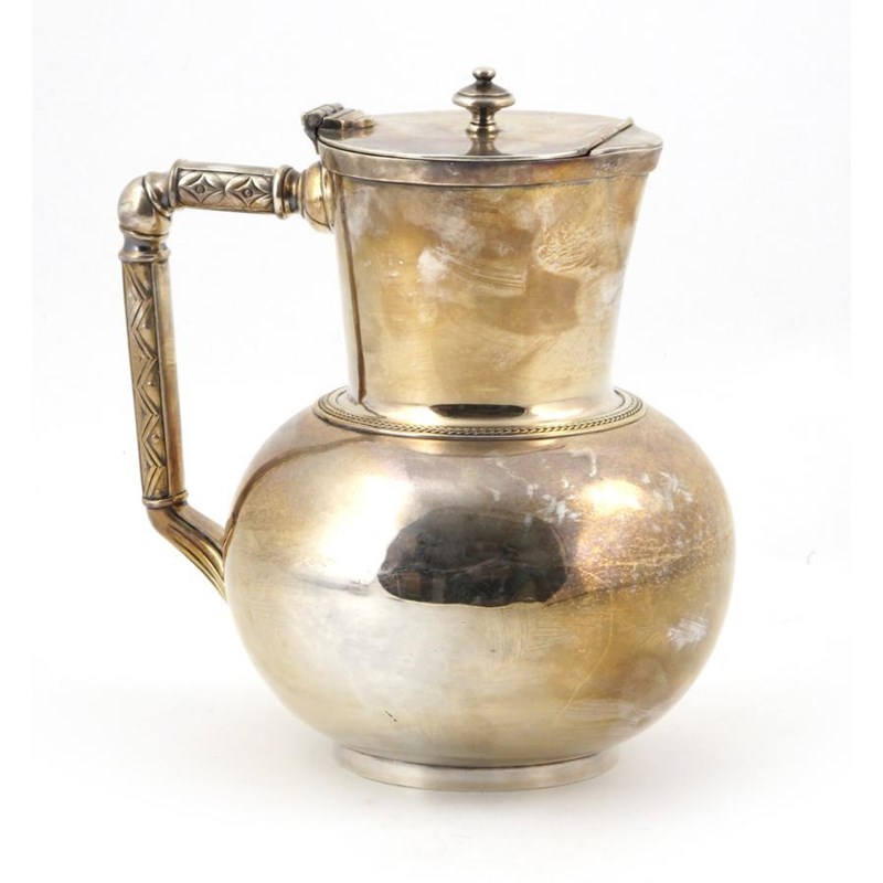 An Elkington & Co electroplated coffee pot with hinged cover, designed by Dr Christopher Dresser, model no. 16587, the rod and ball handle cast in low relief with geometric design, stamped marks 21cm. high