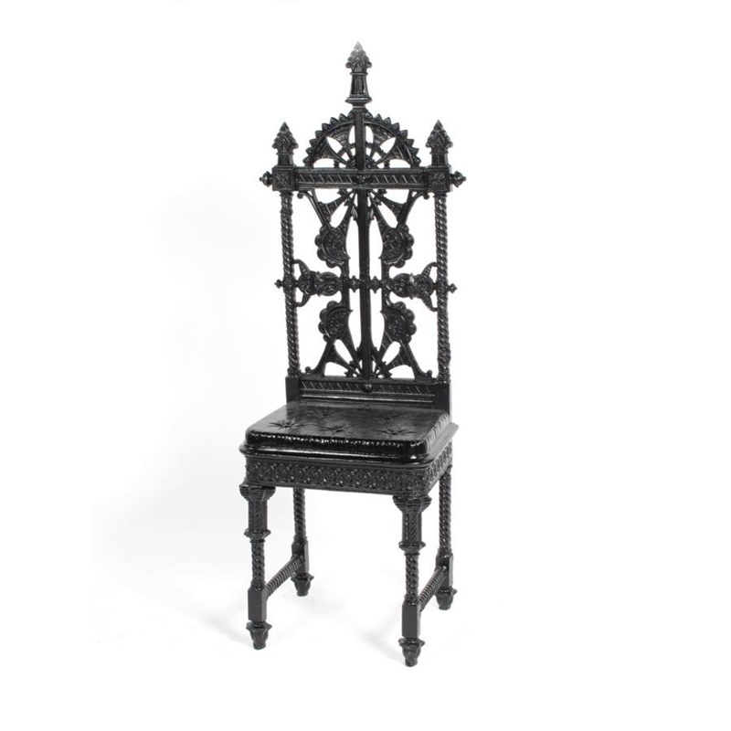 A cast iron chair, the design attributed to Dr Christopher Dresser and John Moyr Smith, the back cast with open panels of geometric flowers and foliage, the seat a faux cushion, painted black unsigned, back legs repaired, 134cm. high
