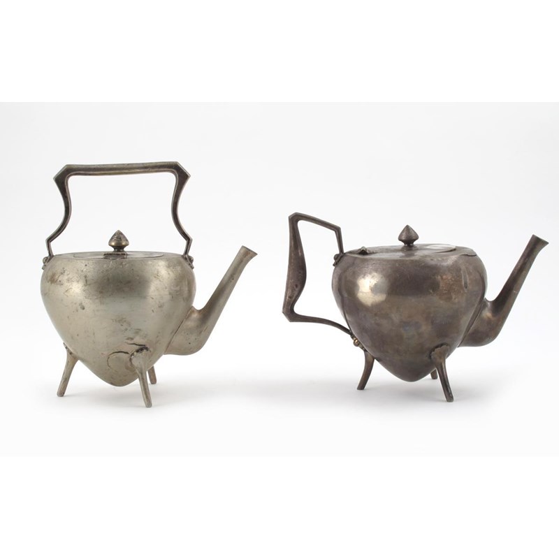 An Elkington & Co electroplated teapot designed by Dr Christopher Dresser, model no.2272, on tripod foot with overslung handle, and another Elkington & Co electroplated teapot and cover designed by Dr Christopher Dresser stamped marks, designed by Dr Christopher Dresser, dents 23cm. high