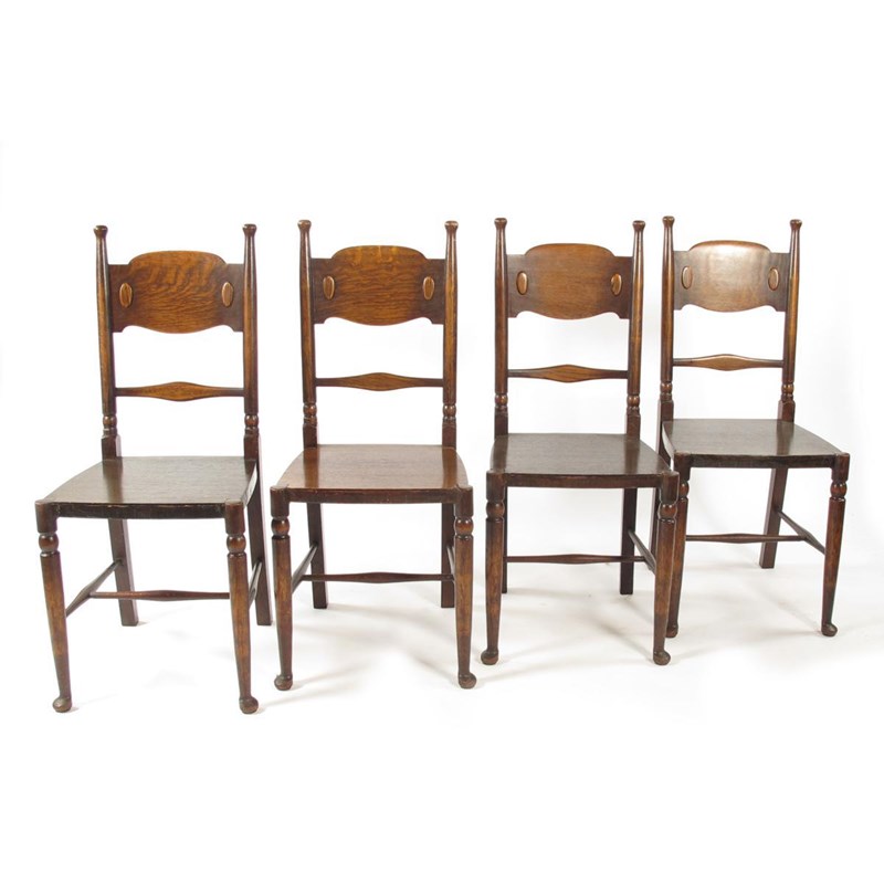 A set of four Arts and Crafts oak chairs, probably William Birch, turned wood legs with bun feet, the back with wood elliptical medallion decoration, replaced seat unsigned 98cm. high