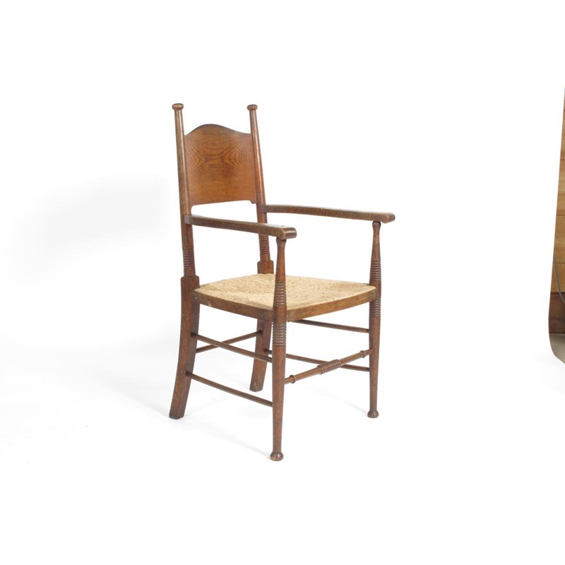 A William Birch oak carver chair, with turned legs and rush seat unsigned 105cm. high
