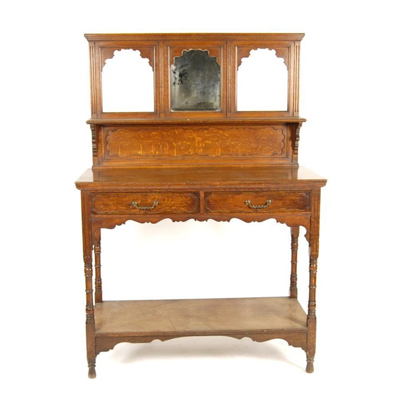 A large Anglo Persian sideboard with pierced gallery, mirrored back above three drawers, on turned feet unsigned 199cm. wide, 234cm. high