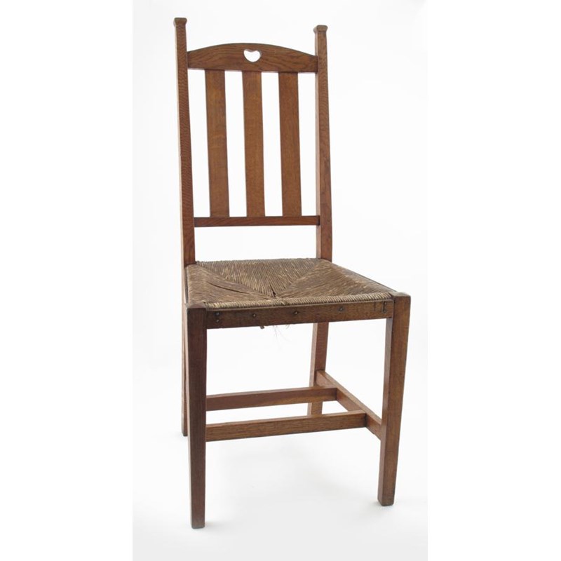 An oak hall chair, probably by Shapland & Petter, rush seated with heart shaped cut out to back, unsigned 101cm. high