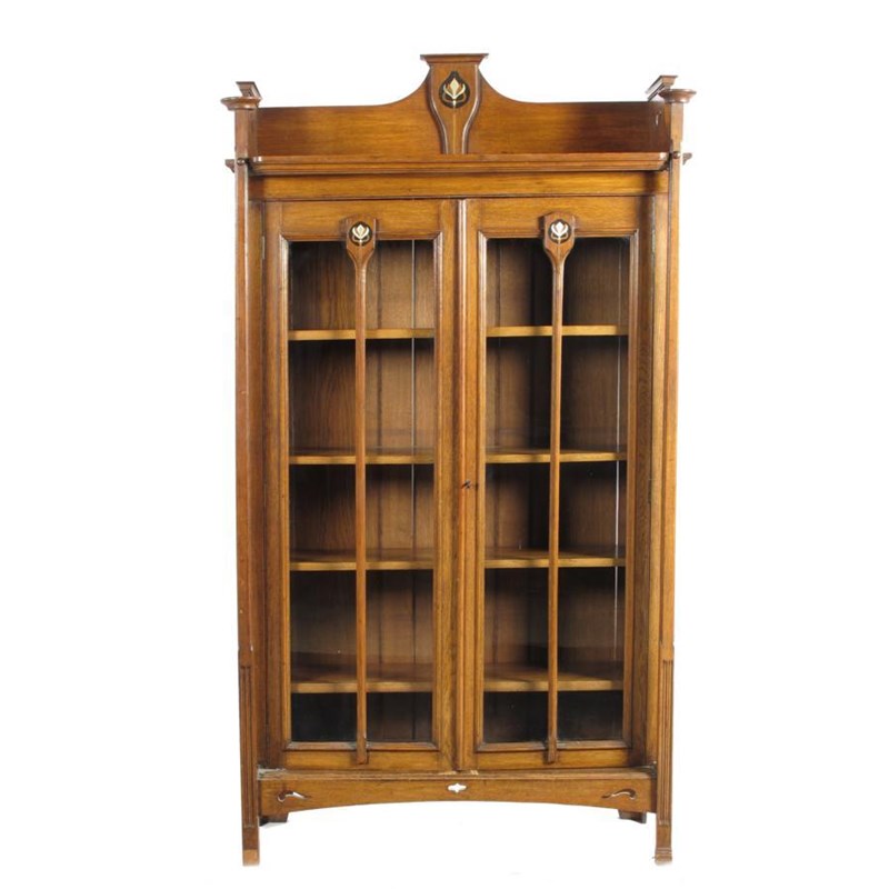An oak glazed book shelf, the glazed door flanked by reeded columns, with inlaid marquetry and steel flower stem decoration unsigned 182cm high, 97cm. wide