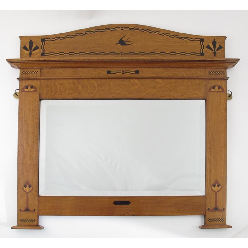 An oak wall mirror, rectangular section, inlaid with marquetry bird, spade and flower stem motif, unsigned 78cm. wide