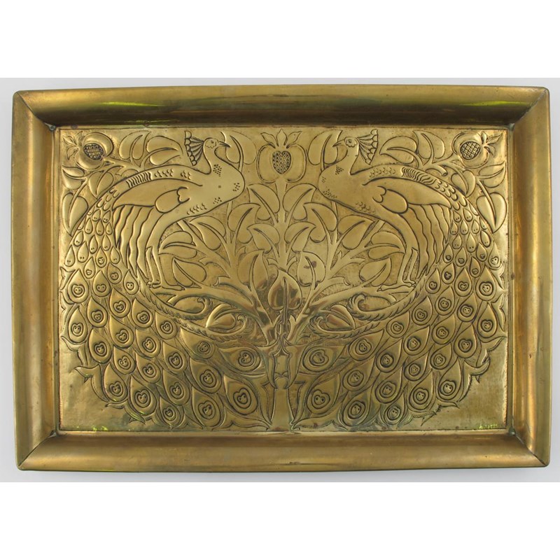 A Fivemiletown, Ireland, brass tray probably by John Williams, hammered in low relief with two facing peacock perched amidst a fruiting pomegranate tree, a large Celtic revival tray and a copper chamberstick, chamberstick stamped Youghal A.M.W, tray 53 x 35cm.