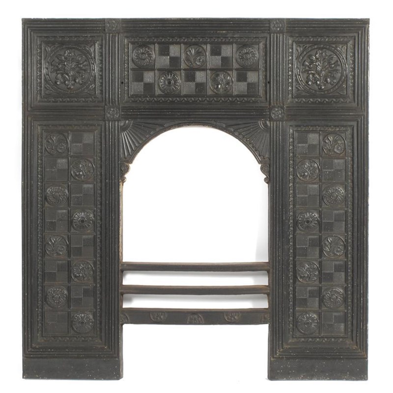An Aesthetic Movement cast iron fireplace, in the style of Barnard, Bishop and Barnard, cast in low relief with geometric panels of flower mon unsigned 97cm. high, 92cm wide