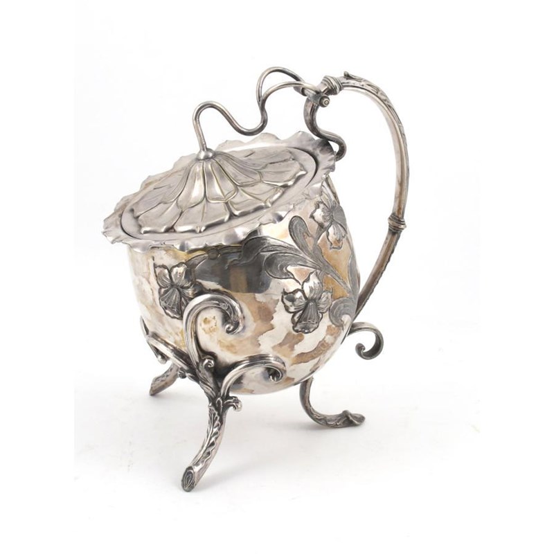 An Aesthetic Movement electroplated basin and cover, modelled with hinged flowerhead cover, the body stamped in relief with daffodil flowers, on tripod foot stamped marks 25cm. high