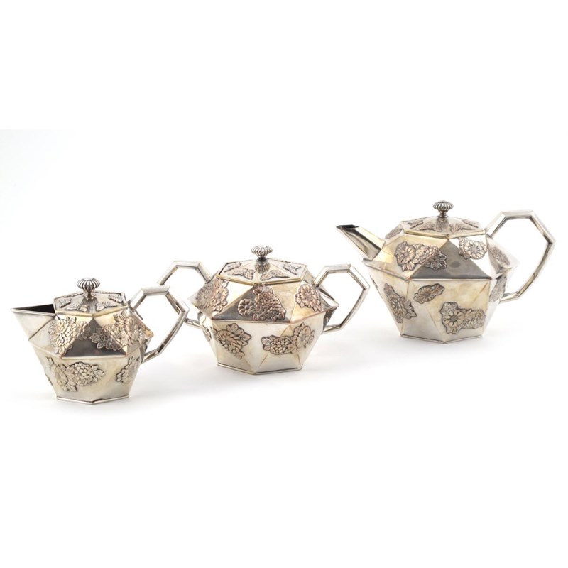 An Aesthetic Movement electroplated three piece tea set, comprising; tea pot and cover, milk-jug, sugar basin and cover, angled shape, cast in low relief with chrysanthemum and butterfly panels unsigned teapot 10cm. high