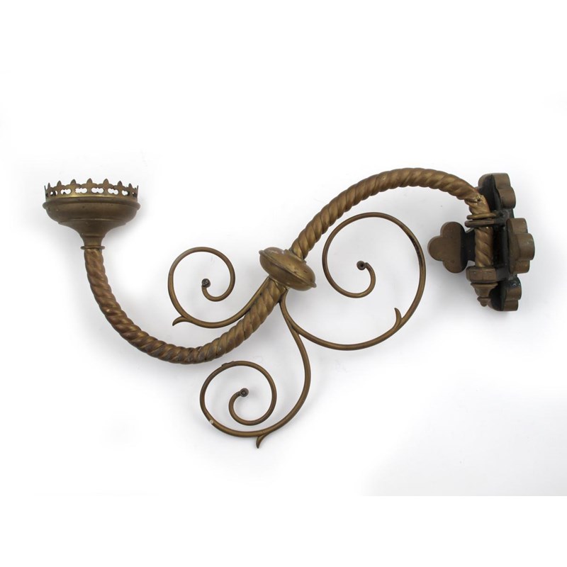 A pair of patinated brass Gothic Revival wall lights rope twist scrolling stem with hinged wall bracket and scrolling wirework decoration unsigned 52cm. wide