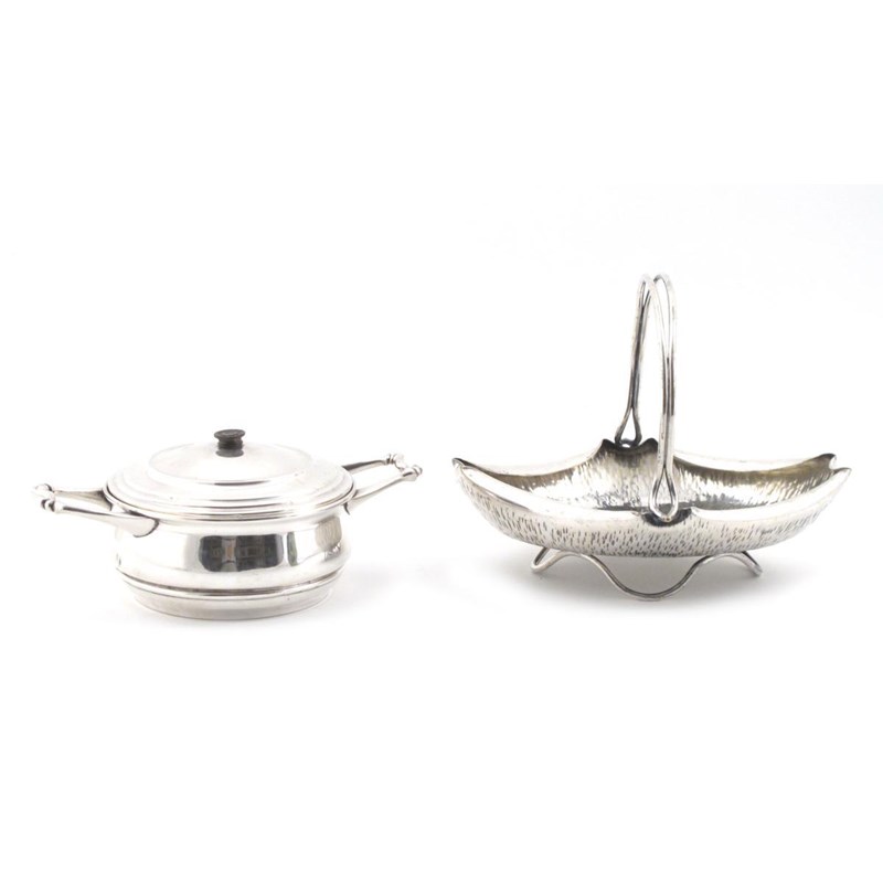 A W.A.S Benson electroplated metal twin-handled pan and cover, the cover with bakelite finial, and a Hukin & Heath electroplated metal basket stamped marks to both 24cm. wide