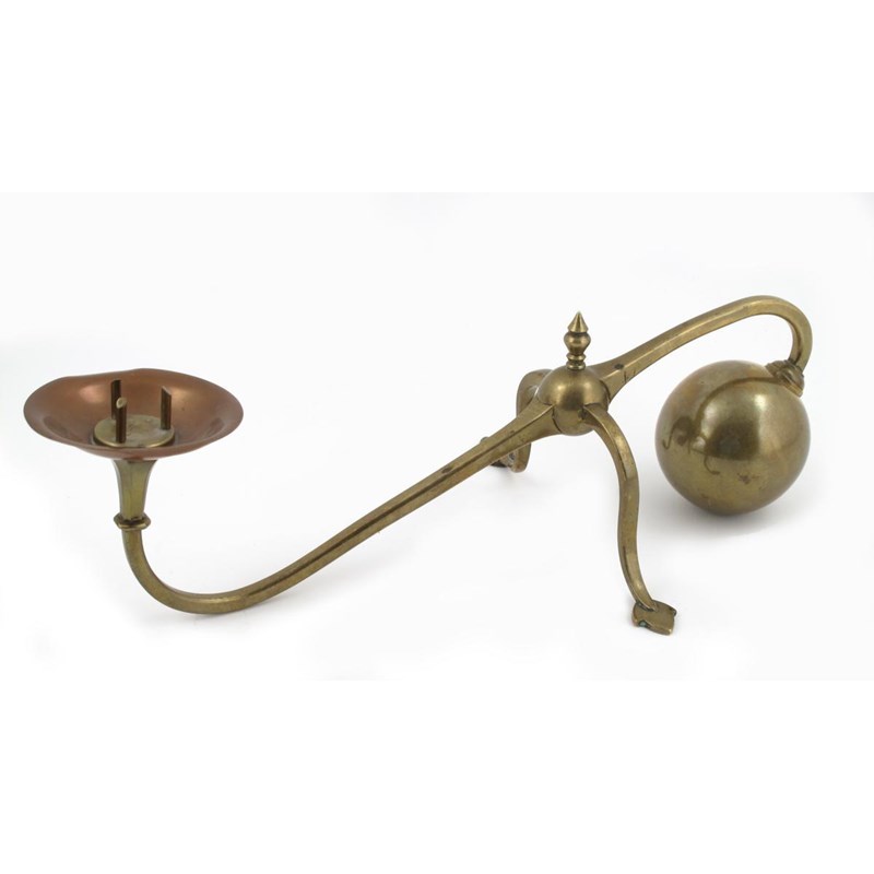 A W.A.S Benson copper and brass candlestick, ovoid counterweight, scroll stem with bronze sconce stamped WAS Benson to sconce 34cm. wide