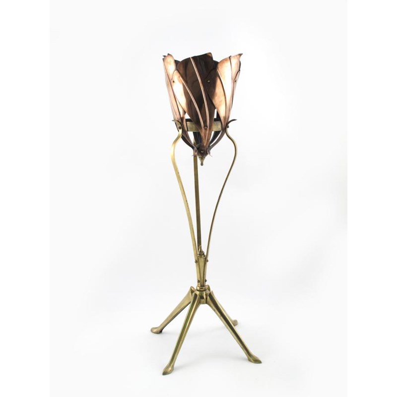 A W.A.S Benson copper and brass jardiniere, the copper bowl of foliate form on tripod stem and flaring angular quadruped foot unsigned 87cm. high