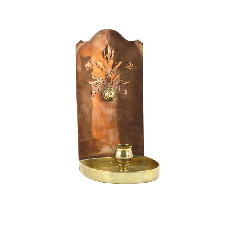A W.A.S Benson copper and brass chamberstick, the copper, curved backplate stamped in low relief with a flower panel designed by Heywood Sumner, unsigned 22.5cm. high