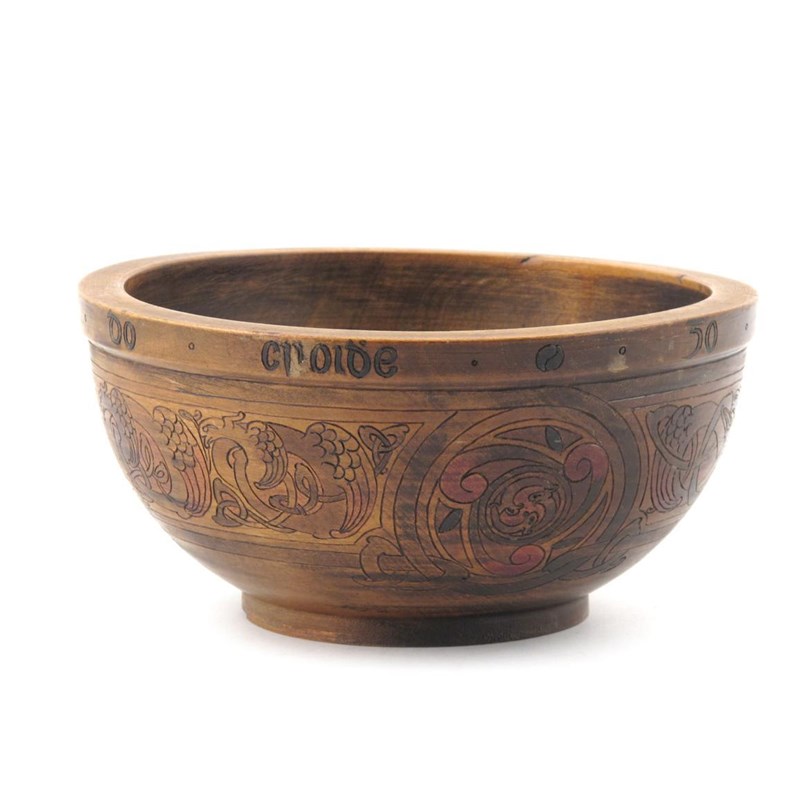 An incised and stained wooden bowl, decorated with Nordic grotesque and foliate designs, below inscription to top rim unsigned 22.5cm. diam.