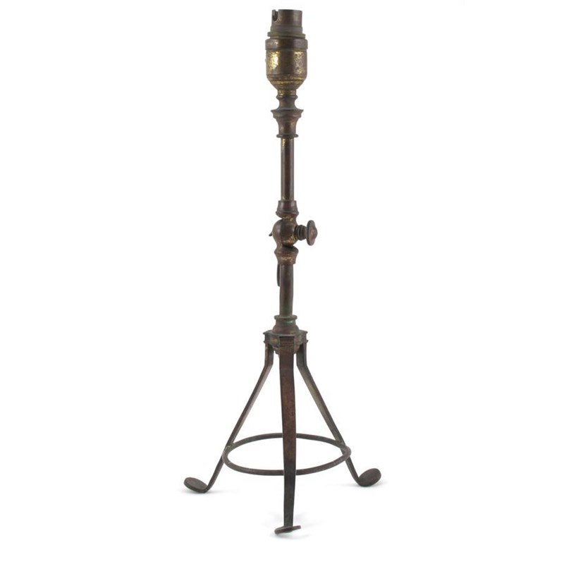 A brass adjustable wall/table lamp the design attributed to W A S Benson, flaring tripod foot with hooked wall mount, stamped 4 to foot 40cm. high