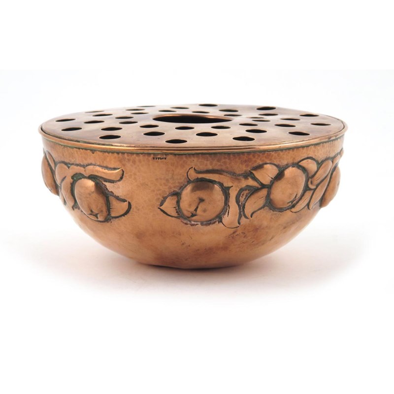A Newlyn copper rose bowl and cover, repousse hammered with a frieze of apples, stamped to the side Newlyn 21cm. diam.
