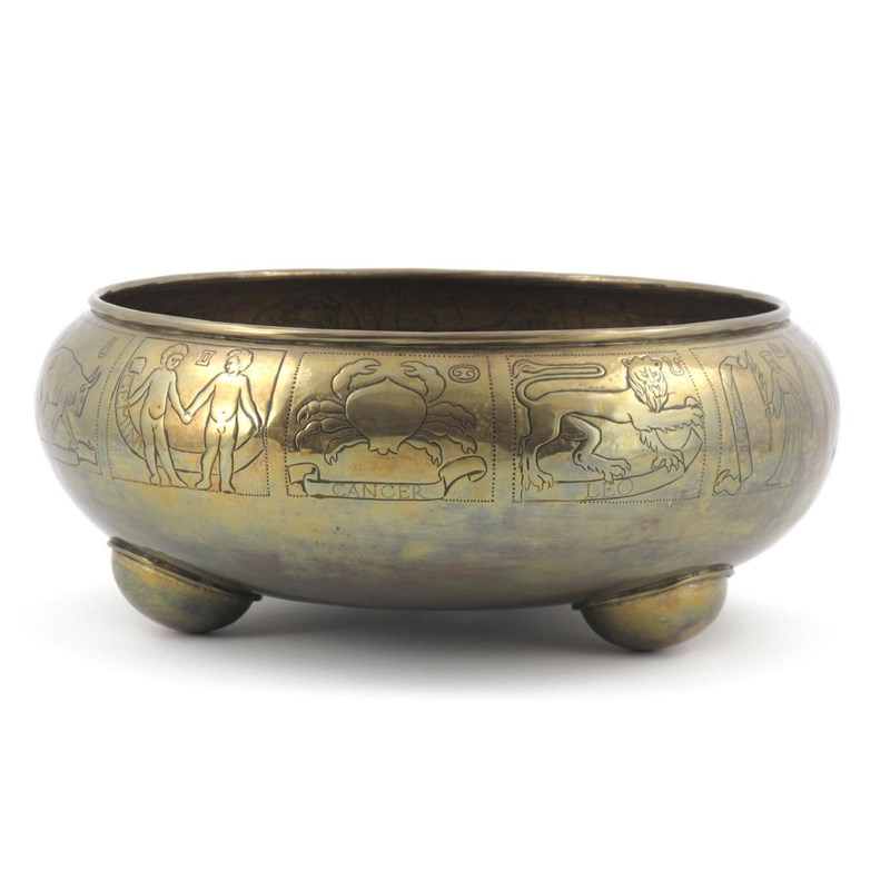 A large Gordon Russell Lygon  brass Zodiac bowl, probably made by George Hart, with inverted rim on three domed feet, hammered and chased with signs of the Zodiac frieze stamped Lygon 36cm. diam.