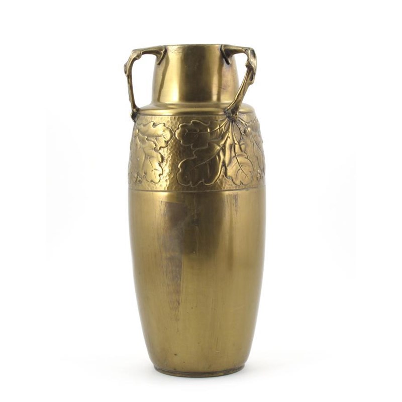 A tall Continental brass vase, shouldered cylindrical form with three applied handles,the handles with knot motif, decorated with a frieze of oak leaf and acorn in low relief unsigned 50cm. high