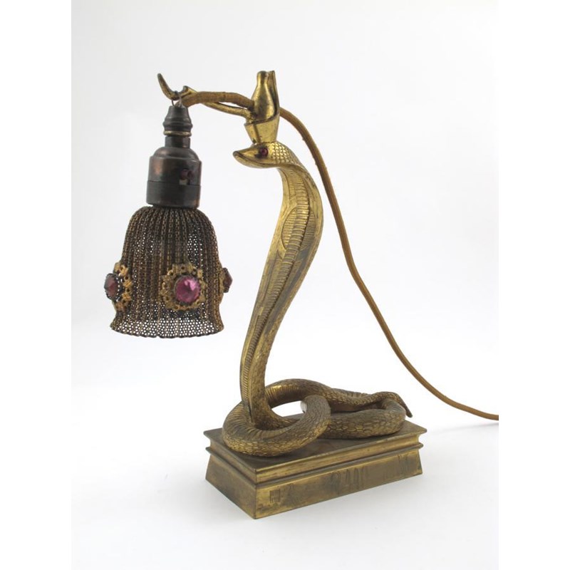 A gilt bronze figural table lamp, modelled as a cobra, on rectangular base with hieroglyphics unsigned 33cm. high