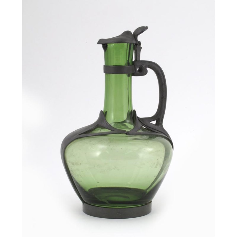 An Orivit pewter and green glass decanter, with pewter strapwork frame, stamped marks 19cm. high