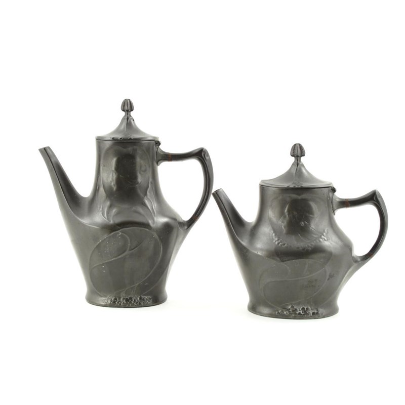 A Kayserzinn pewter coffee pot and tea pot, designed by Hugo Leven and Hermann Fauser, organic form cast in low relief with an Art Nouveau maiden stamped factory marks coffee pot 24cm. high