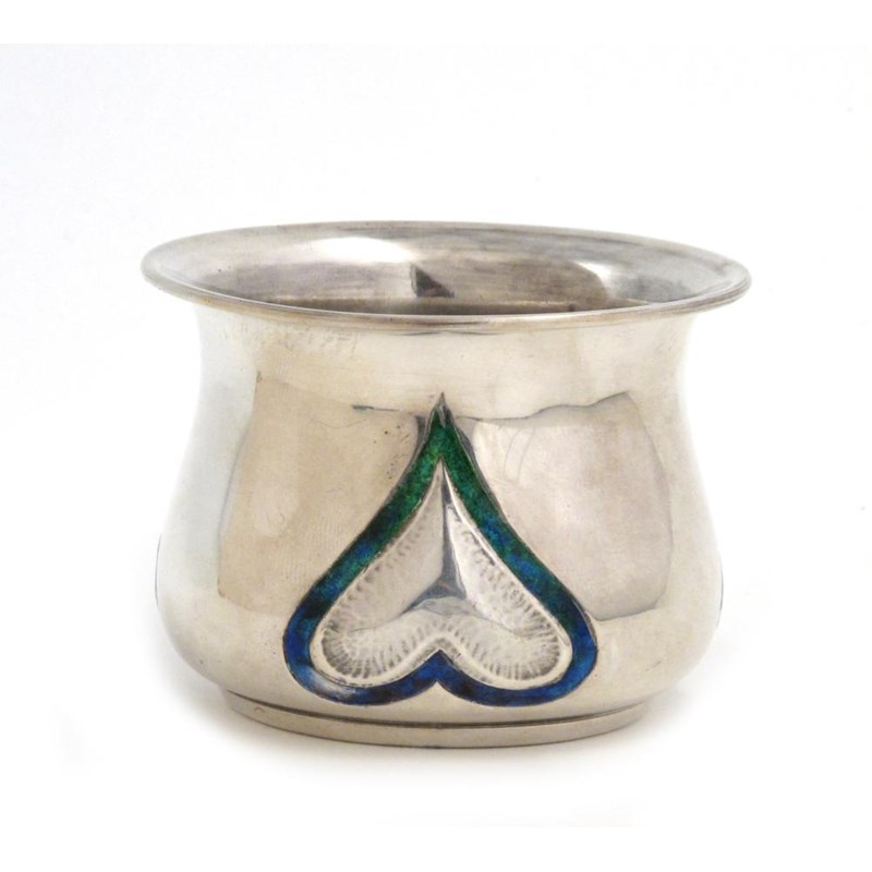 A Liberty Cymric silver and enamel bowl, model no.2199, the design attributed to Oliver Baker, cast in low relief with three heart shaped foliate motif enamelled in blue and green stamped marks, L & CO Cymric Birmingham 1904 6.5cm. high