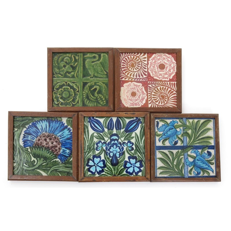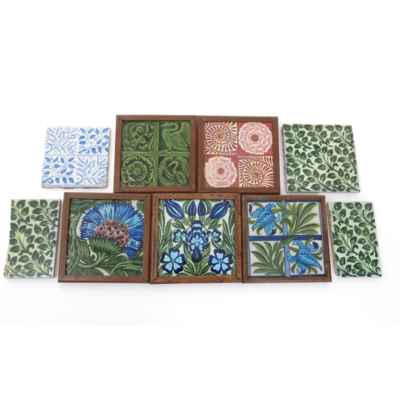 A William De Morgan Merton Abbey tile, modelled in low relief with quartered panels of bird and flower motif, glazed green, a William De Morgan ruby lustre tile, five other William De Morgan tiles and a Morris & Co tile impressed marks, damages 14.5cm. square (9)