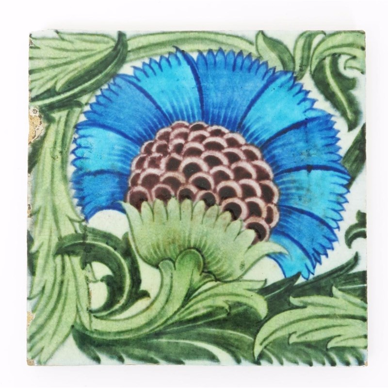 A William De Morgan Early Fulham BBB large 8 inch tile, painted in shades of blue, aubergine and green on a white ground impressed roundel mark, minor frit chips, 21cm. square