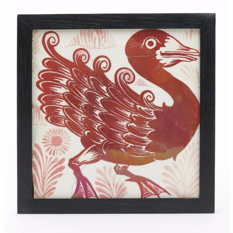 A William De Morgan Duck and Foliage tile, painted in shades of ruby lustre, later framed 14.5cm. wide