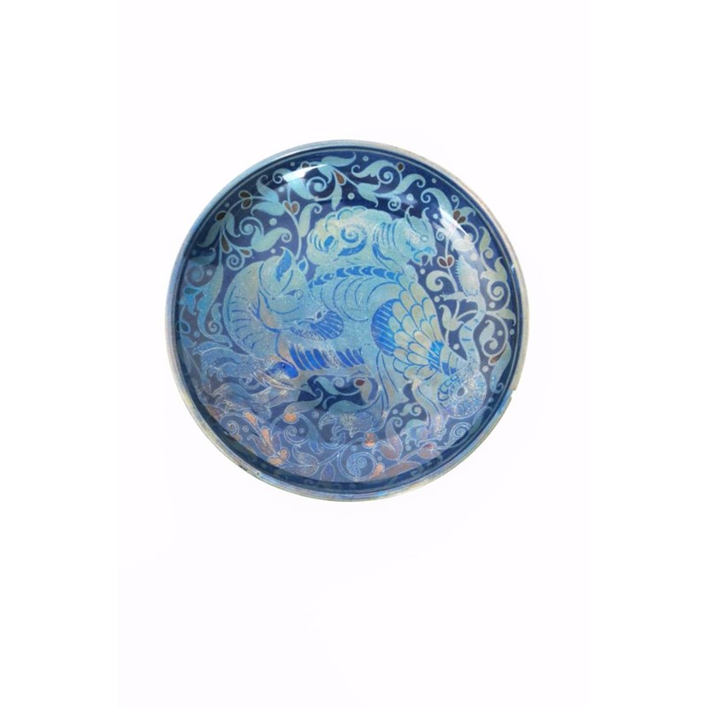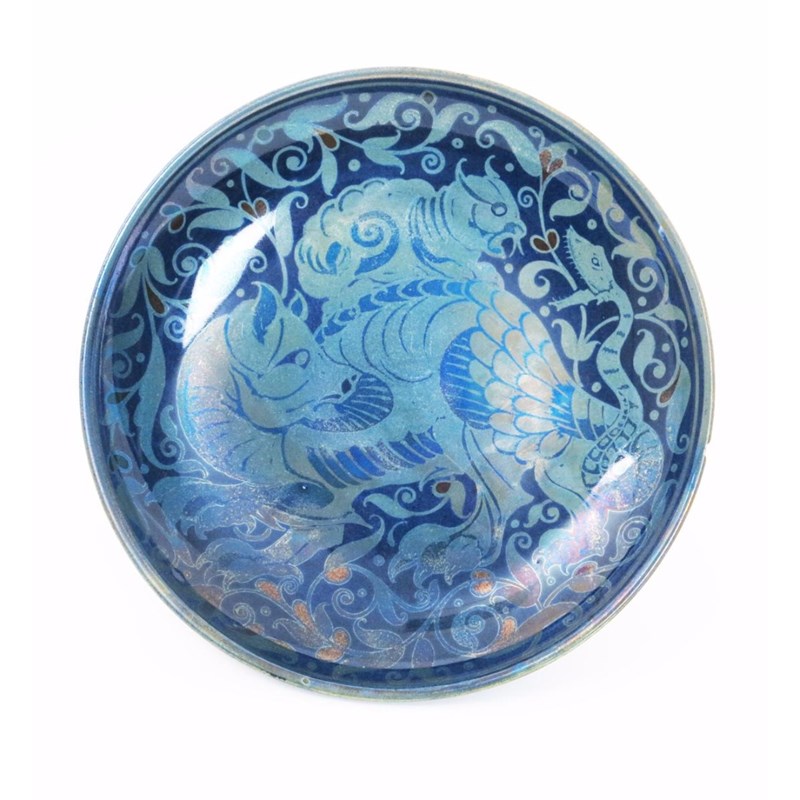 A William De Morgan Sunset and Moonlight suite tazza by Fred Passenger, painted to the well with a grotesque creature, with young resting on its back, its tail rising to form an attacking serpent, inside scrolling border, in ruby and silver lustre on a blue lustre ground painted FP monogram, small chip to rim, 23cm. diam.