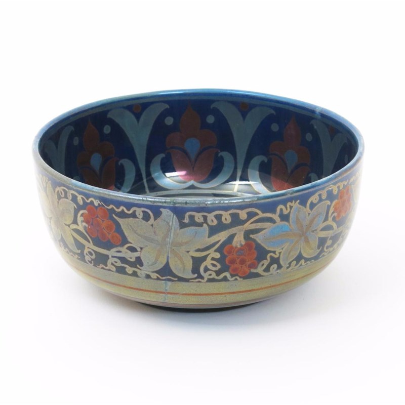 A William De Morgan Sunset and Moonlight Suite triple lustre bowl by Fred Passenger, painted to the exterior with a frieze of fruiting grape vine, the interior with stylised flower border and central flower roundel, in gold and ruby lustre on a blue lustre ground, and William De Morgan Arts and Crafts Potter a reference book by Rob Higgins and Christopher Stolbert Robinson painted FP monogram, fine firing crack to rim 19cm. diam. (2)