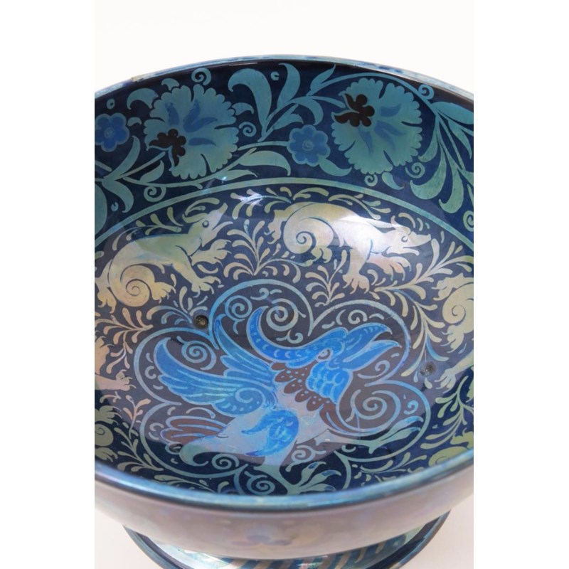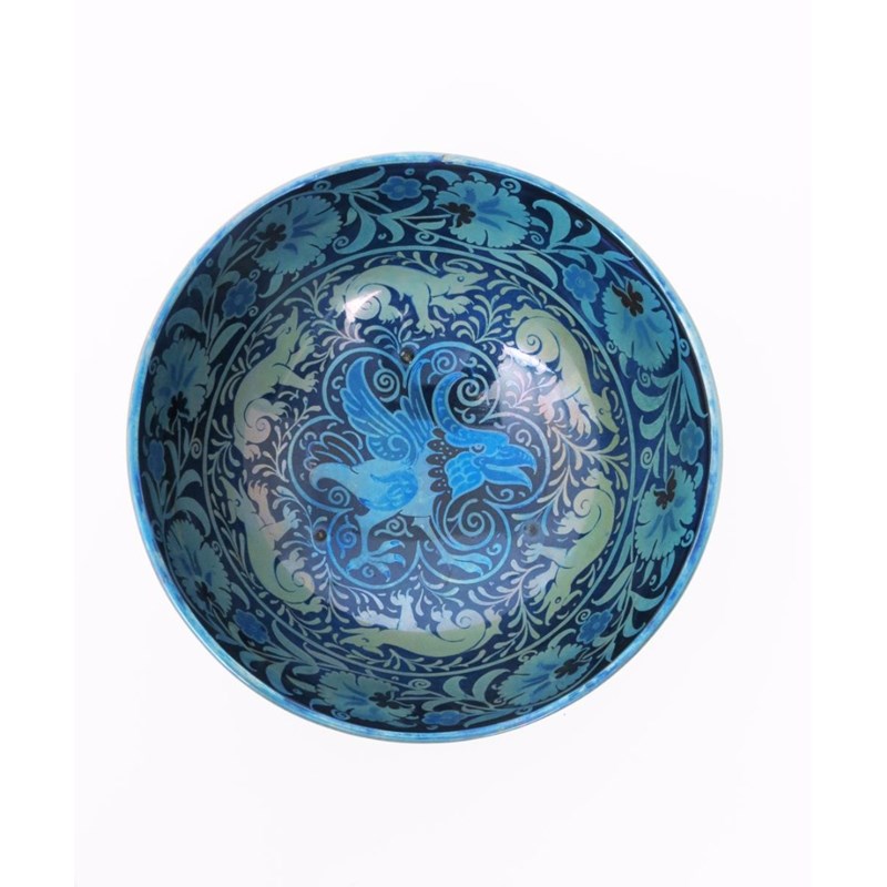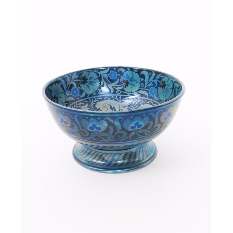 A William De Morgan Sunset and Moonlight pedestal bowl by Fred Passenger, the well painted with a mythical crested bird inside a border of clawed creatures on a scrolled foliate ground, the rim a border of carnation, the exterior borders of flowers and foliage in blue and sand lustre painted FP monogram, paper collector's label, 22cm. diam.